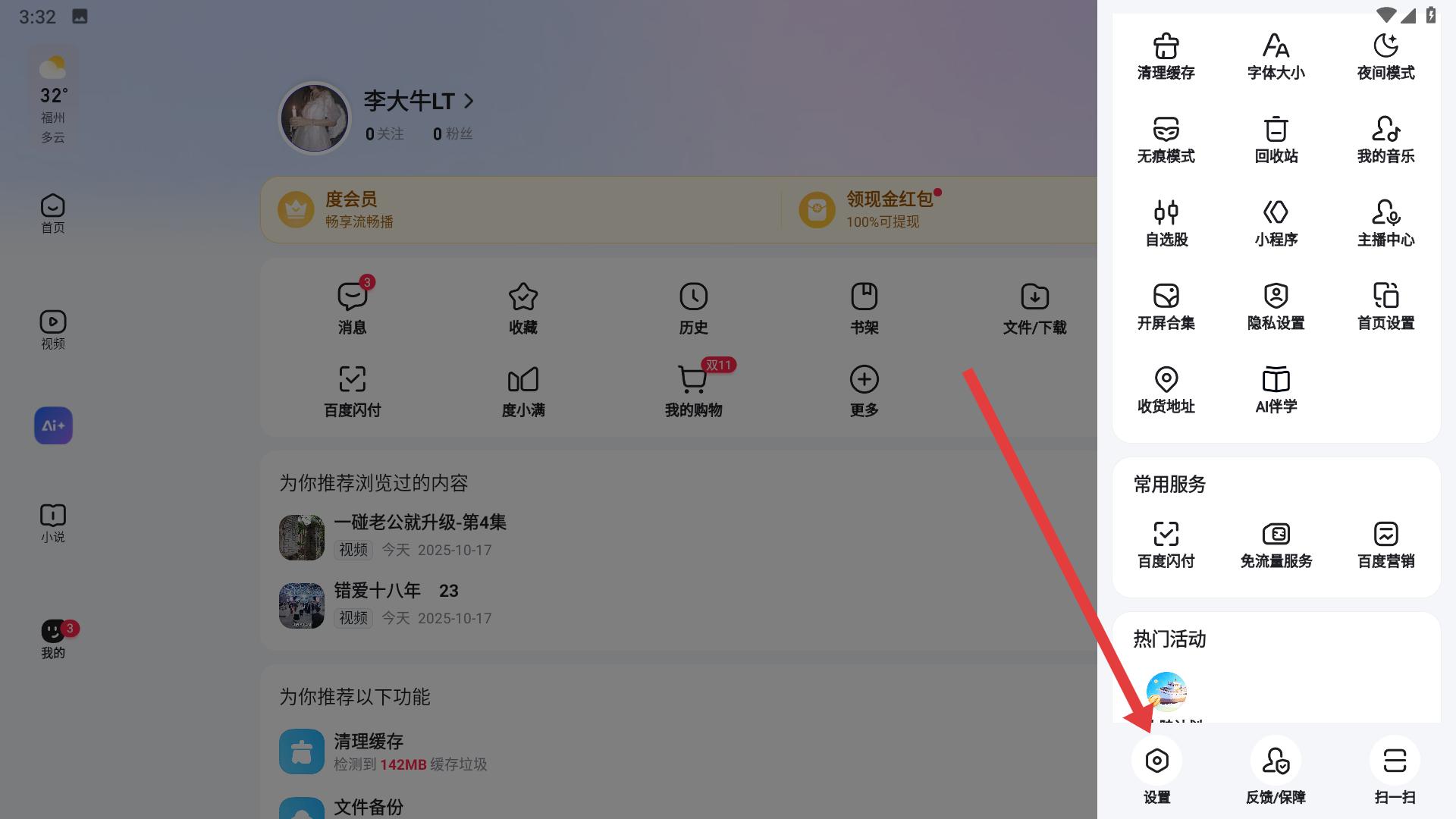 2、个人相关界面,点击右上角相关图标,弹出包含常用服务、热门活动等内容的菜单,找到设置并点击。