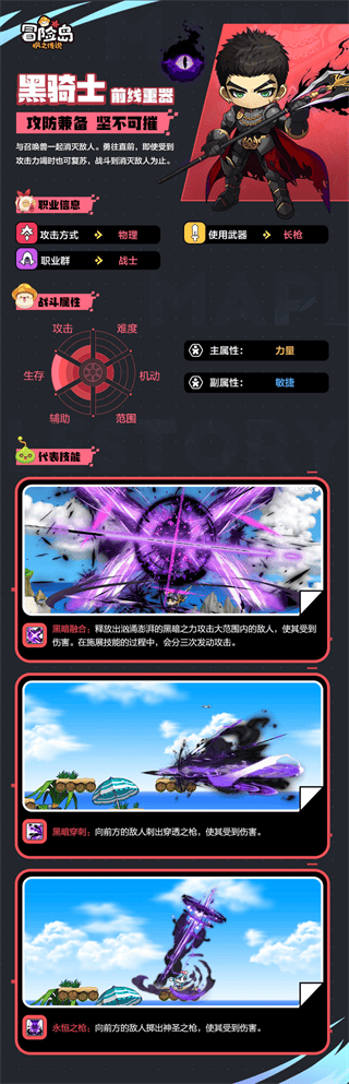 ·如果玩过冒险岛类游戏的话,黑骑士他的防御以及攻击都算是比较平衡的,所以没有什么特别亮眼的地方,除了不用等待回合冷却的技能之外,其他方面都跟战士属性差不多。