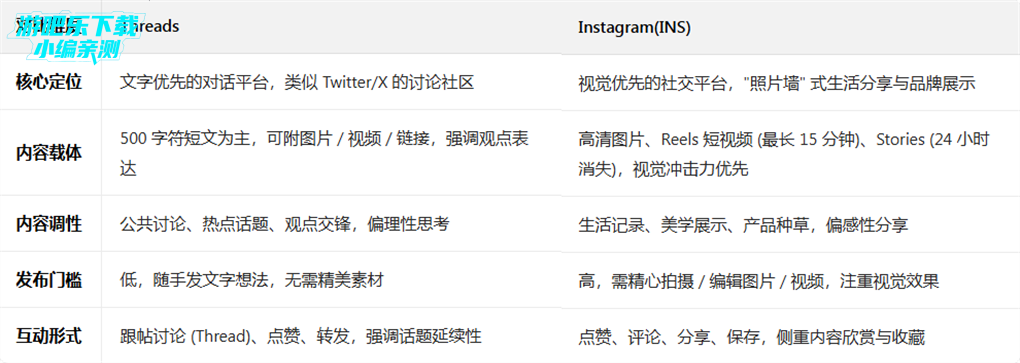 Threads 是 Meta 推出的文字优先的对话型社交平台,主打实时观点交流与公共话题讨论;Instagram 则是视觉优先的综合社交平台,侧重图片 / 视频展示与个人品牌塑造。两者账号互通但定位迥异,Threads 适合深度讨论与思想表达,Instagram 适合视觉内容创作与品牌营销。