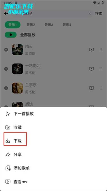 4、最后点击过后会弹出下一首播放、收藏、下载、分享、添加歌单、查看mV选择,我们点击【下载】即可
