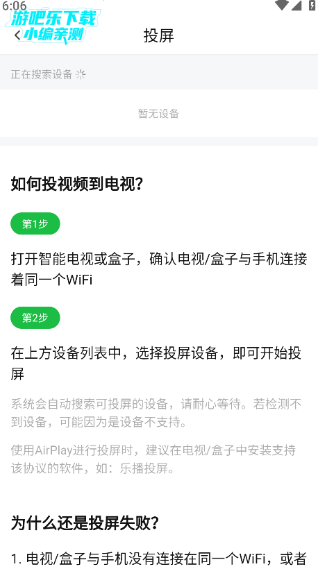 3.将我们的手机和电视连接同一个WiFi,然后点击搜索出来的投屏设备开始投屏即可。