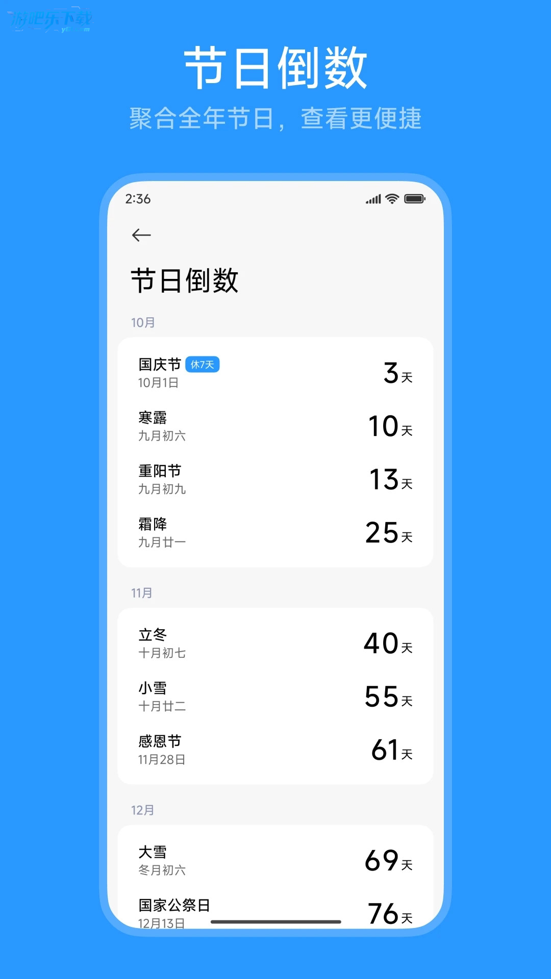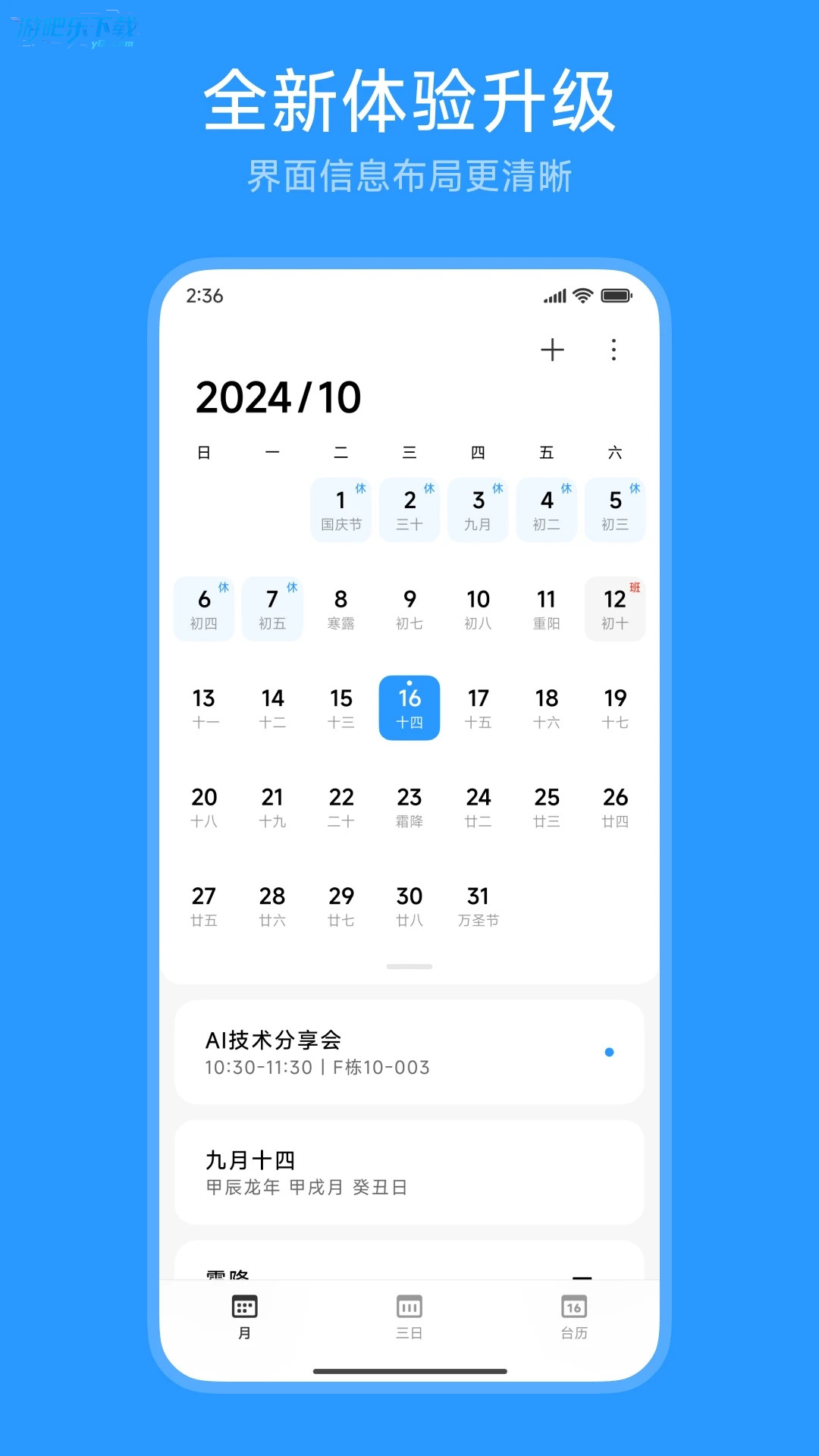 基础日历管理:清晰展示日期、星期、节假日,支持农历与公历切换。