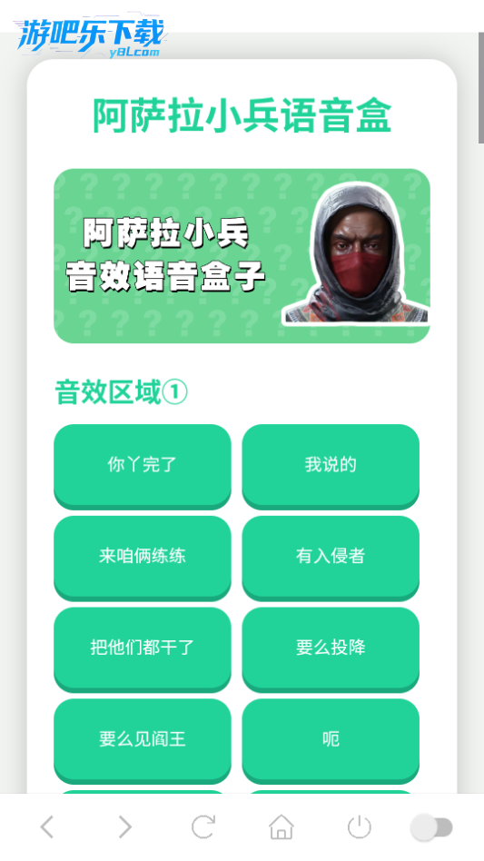 阿萨拉小兵语音盒免费版B站UP主“趣味语音盒”自制的语音包盒子软件。阿萨拉小兵语音盒app主要收录了游戏《三角洲行动》里阿萨拉小兵的各种台词,为喜欢这款游戏的玩家提供专属语音资源。快来下载使用吧!