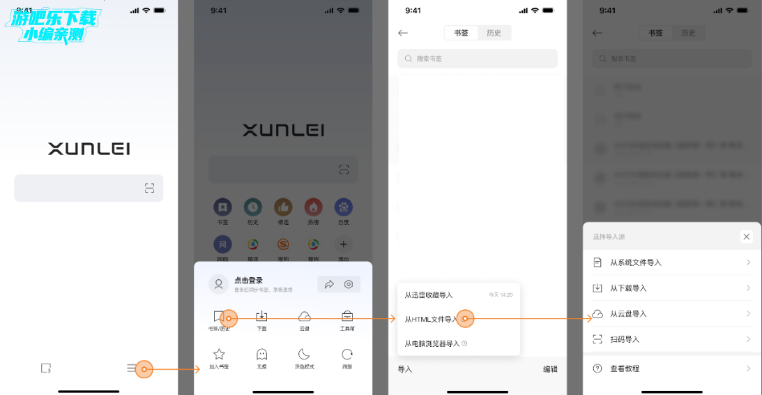 2、将导出书签.html文件,发送到手机上,打开「迅雷浏览器-书签-导入」,点击「从HTML文件导入」,选择对应的导入方式即可