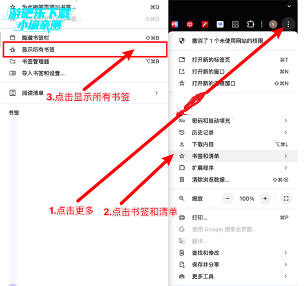 1、点击地址栏右侧3个点「更多」-「书签和清单」-「显示所有书签」