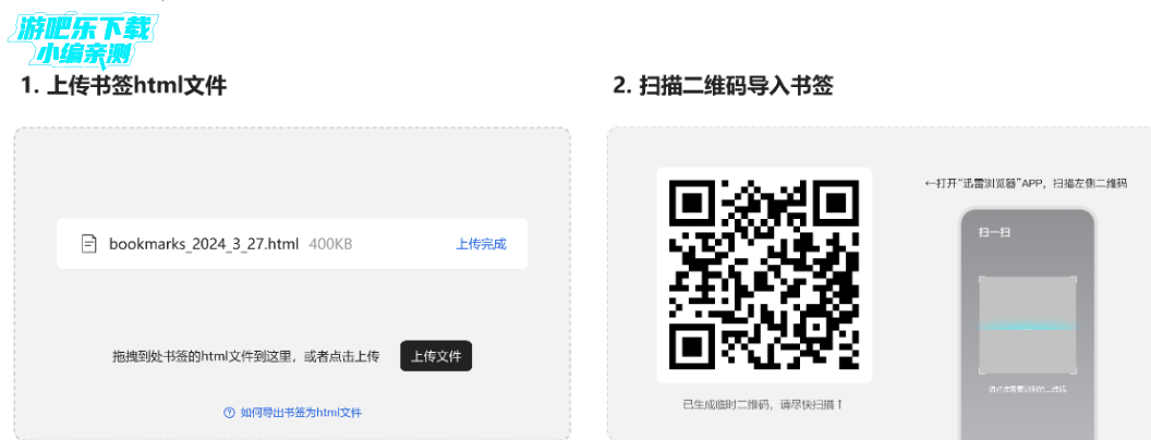 1、打开「迅雷浏览器官网-导入电脑书签-生成书签html二维码」,将导出书签.html文件,上传到网页中,生成二维码,使用迅雷浏览器扫码(Android版本>=1.0.7)即可