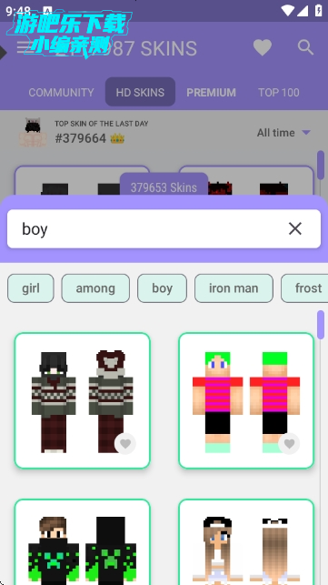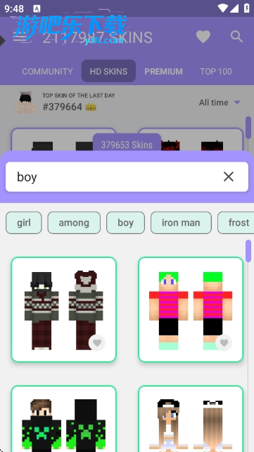 3、在“HD SKINS”等板块中输入关键词(如“boy”)精准查找皮肤。