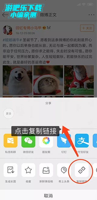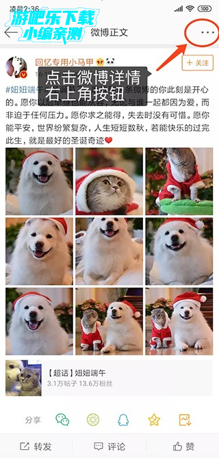 1、打开便捷下载,这里以微博为例,其他平台类似,均为“复制链接”下载。在微博详情中,点击右上角按钮。