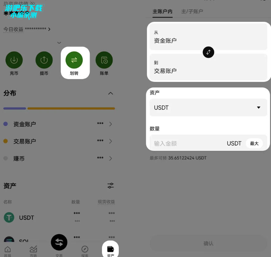 进入 App 首页点击底部【资产】-【划转】,选择想要划转的币种,填写数量-【确认】,将所需进行交易的数字资产从【资金账户】划转到【交易账户】,即可体验更多交易。