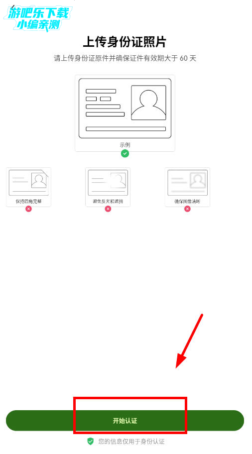 4、点击下一部后提示上传身份证照片,我们点击开始认证;
