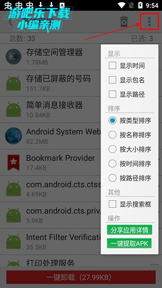 4、也可以点击右上角的按钮,进行多项操作,比如一键提取apk、分型应用详情、显示时间包名路径等等;
