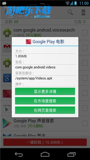 1.长按列表可显示程序的详细信息:大小,安装时间,包名,apk文件的路径等,可按apk文件名,包名,应用名在网页搜索和在市场搜索。