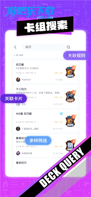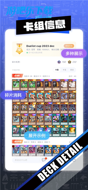 2.智能卡组构建:内置禁限卡列表、稀有度标记及卡组断点搜索,提供融合杯/同调杯等赛事模板,支持自定义卡组上传与胜率分析;