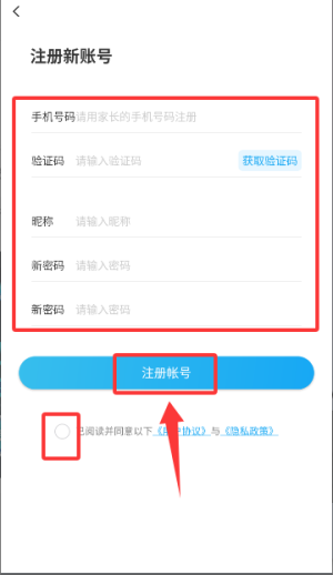 3、填写监护人手机号码、短信验证码、用户昵称及登录密码,勾选协议后完成注册。
