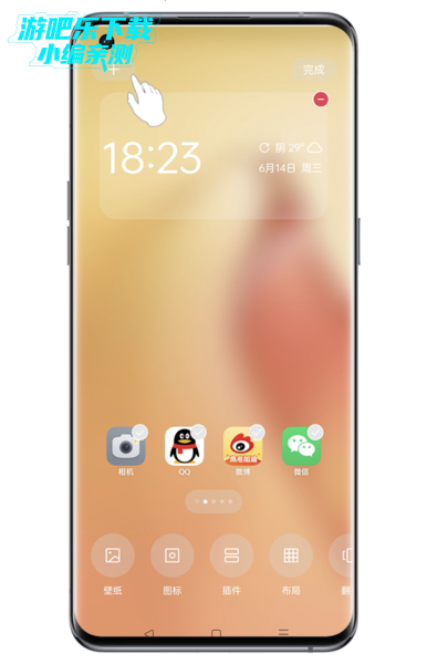 1、ColorOS 12及以上系统版本:可双指放在屏幕斜对角,向内捏合进入桌面编辑界面,点击左上角+号。