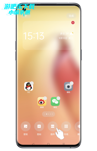 2、ColorOS 3.0-11.3系统版本:可双指放在屏幕斜对角,向内捏合进入桌面编辑界面,找到“(添加)插件”并点击,选择需要的“时钟插件”,点击添加即可。