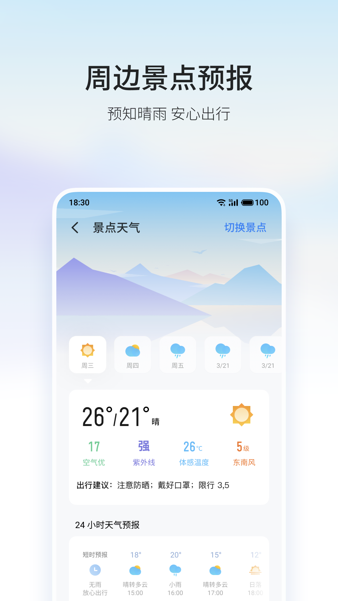 支持分钟级短时预报、24 小时逐时预报,实时监测阴晴雨雪,提前规避早晚温差风险;提供 15 天趋势预报 + 40 天长期预报,满足日常通勤与长途出行规划需求。覆盖国内 200 + 城区精准定位,支持多城市管理,自动切换当前所在地天气;专属景点天气功能,提供旅游目的地气象实况与出行建议,适配旅游规划场景。