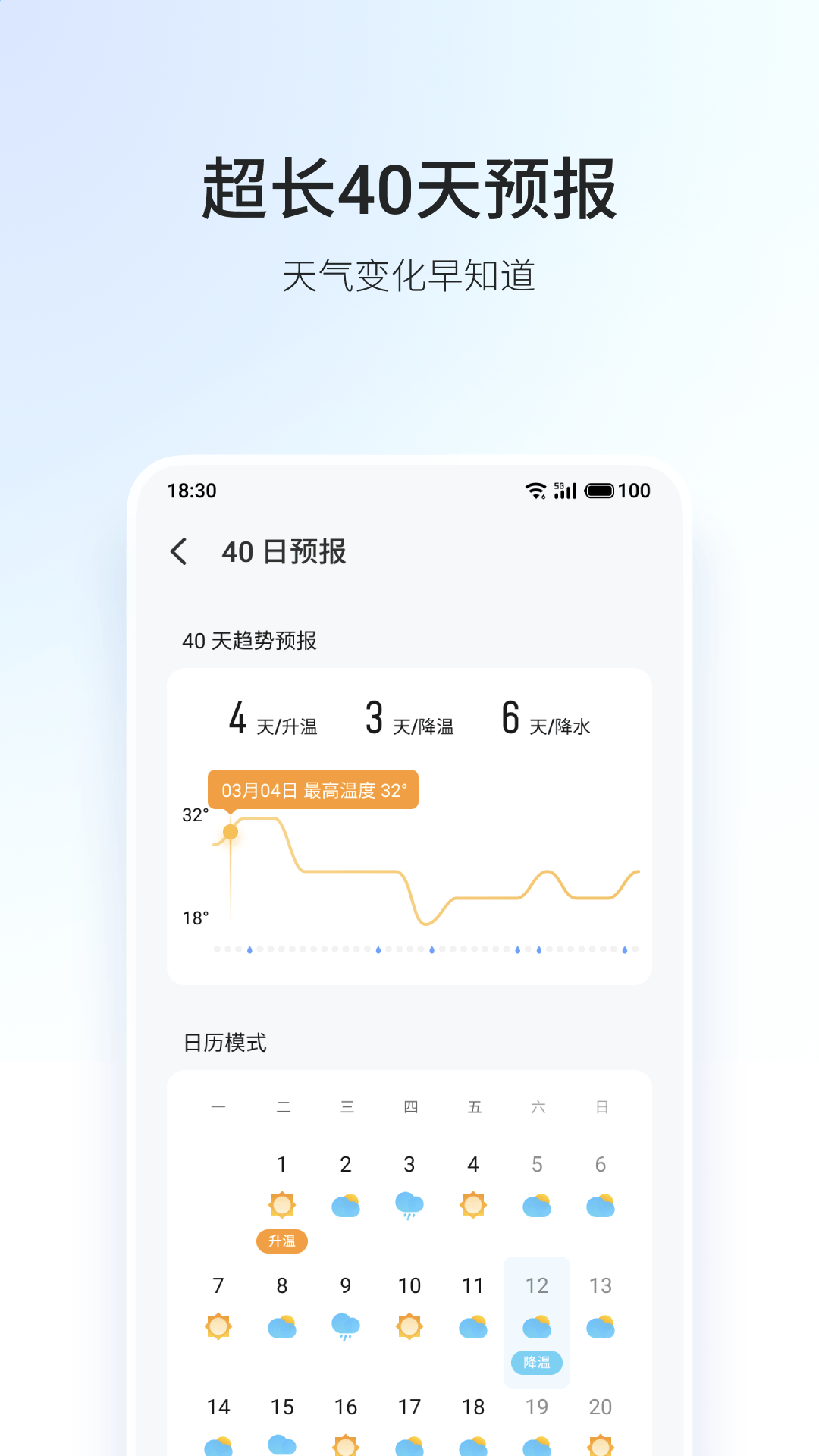 40 天预报:在 15 天预报区域继续向下滑动或点击 "40 天预报" 入口