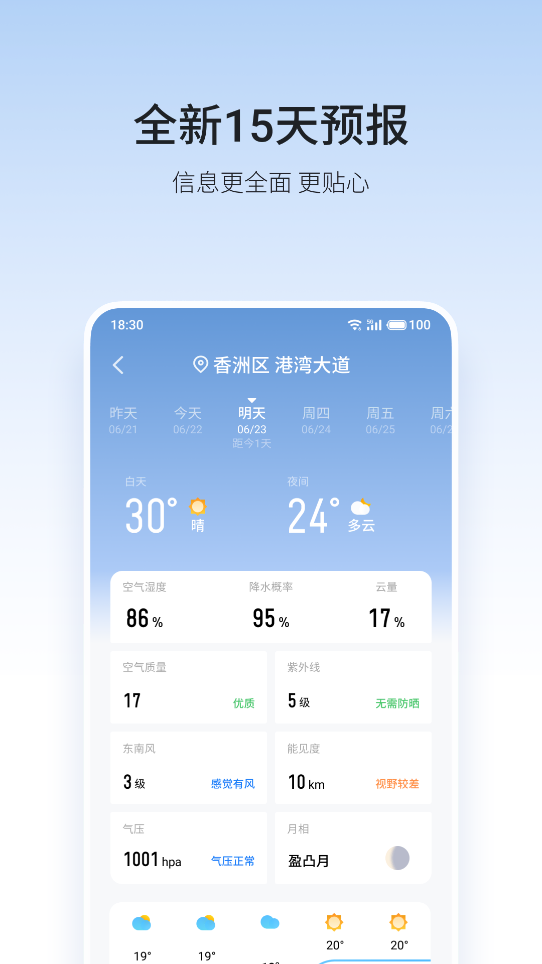 15 天预报:首页向下滚动,找到 "15 天预报" 模块,查看温度趋势和天气变化