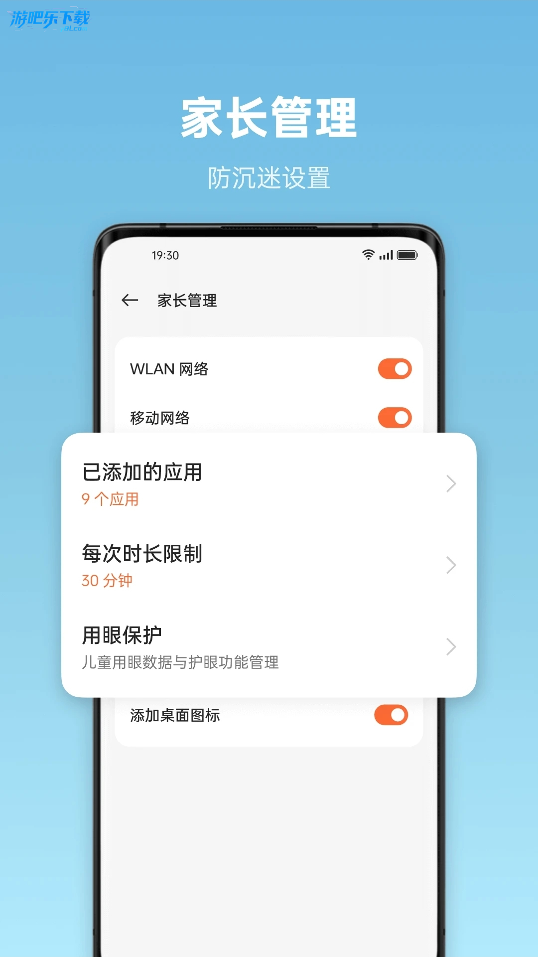 1.应用管理:自由设置桌面应用,避免儿童不宜的应用内容。