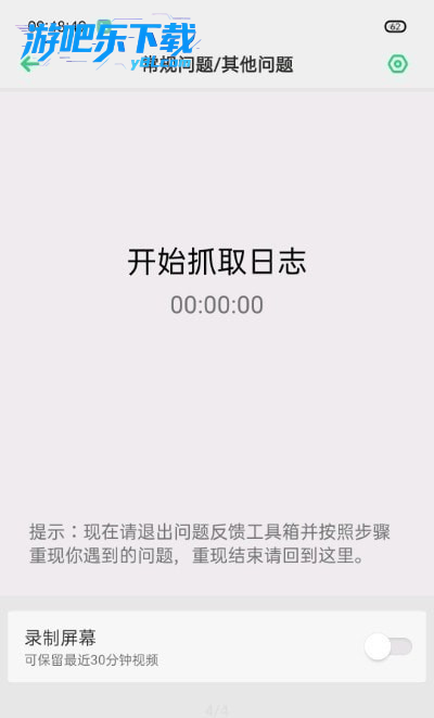 2.打开“屏幕录制”开关,点击“开始抓取”,然后让反馈工具箱保持后台运行,操作手机复现(让问题再次出现)你刚才出现的问题,复现之后立即截图,保存问题出现的时间点。