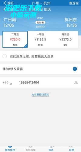 3、进入购买火车票页面可以选择一等座或二等座,填写联系手机,在线选座等。