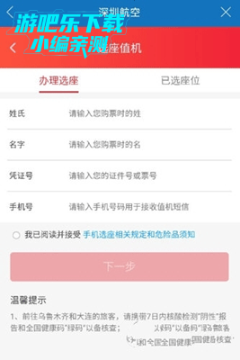 2、点击航空右侧的【值机选座】,输入姓氏、名字、凭证号、手机号,点击【下一步】。