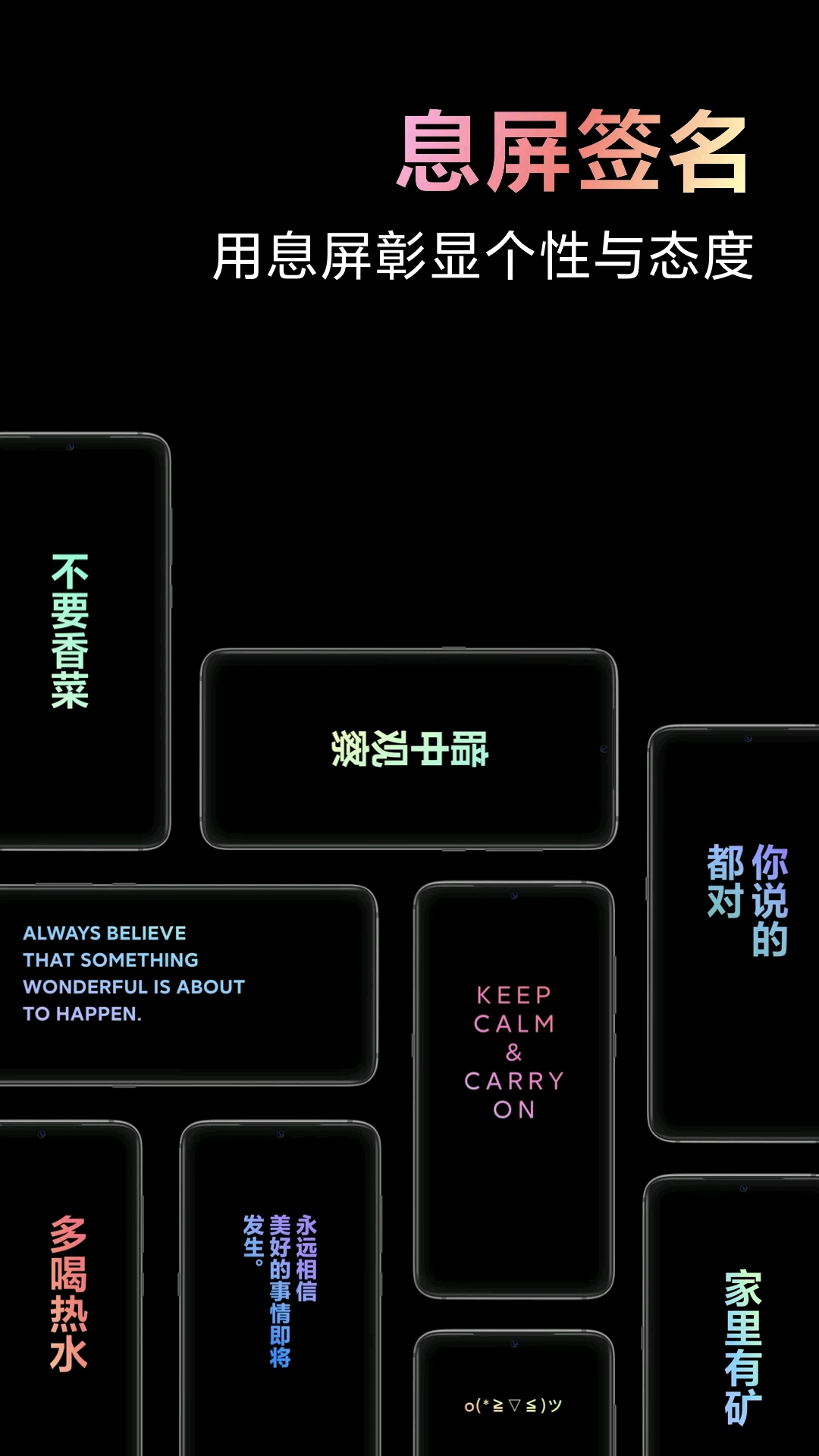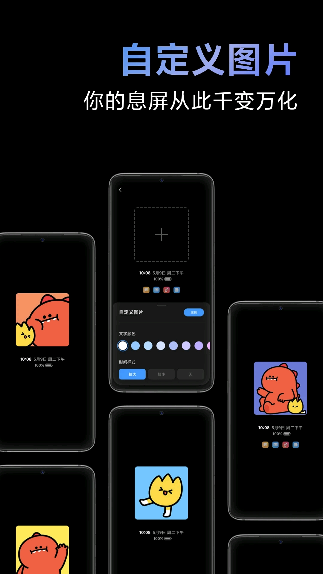 仅支持小米 / Redmi OLED 屏幕机型,利用屏幕自发光特性实现局部显示,息屏状态下耗电量极低,连续常显不影响日常续航。内置时钟、文字、图片、动态特效等多类息屏模板,涵盖简约风、科技风、动漫风、节日限定等风格,支持自定义背景图、字体颜色、显示布局。