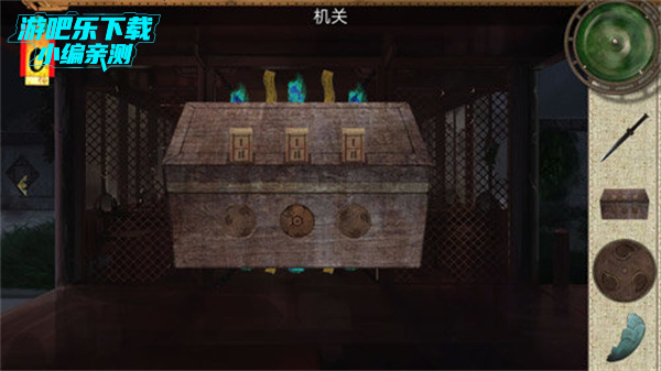2、到大堂里面 ,就是有个铁链,锁着一个面具的地方开启盒子可以获得另外一个面具。把木盒放到面具前,然后把抽屉找到的圆圈放上去,旋转调整高度,把三个调整到最好就可以了。