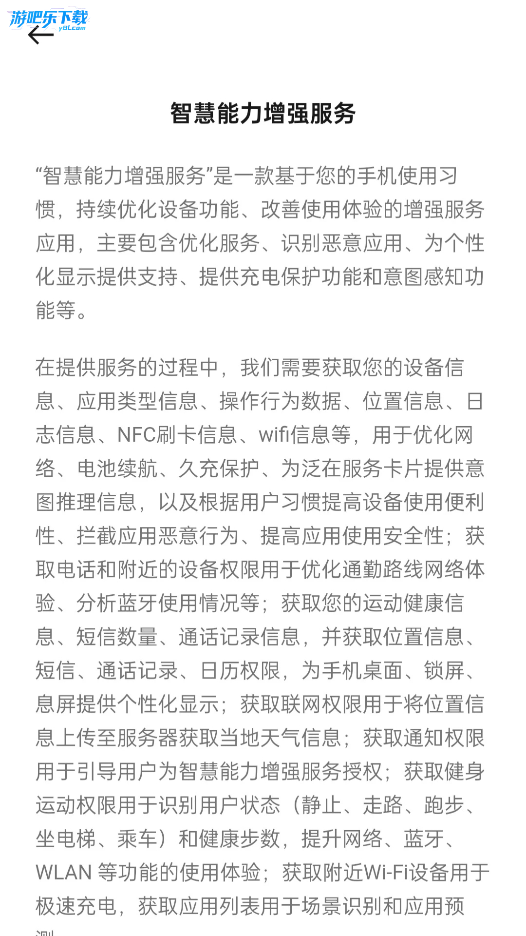 权限要求:智慧能力服务需要位置、设备信息等权限才能正常工作,开启时请确保已授予必要权限