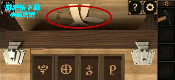 5、根据符号输入相应图案打开上方最左边的箱子,拿走小刀。
