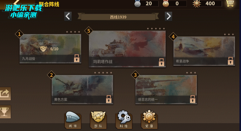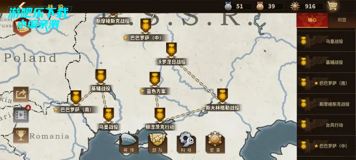 (2)每一篇章的关卡由小关和大关组成,每2-3个小关后有一个大关(也称星关),剧情上小关是对大关的拆解,大关是对小关的总括和收尾。例如大关【巴巴罗萨·南】前置【乌曼战役】、【基辅战役】两个小关。当两个阵营的最后一个小关都通关,才能解锁下一章。