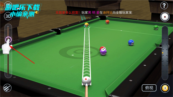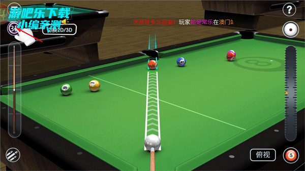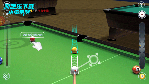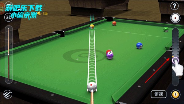 和电脑AI对战,有标准的8球和9球规则,触摸屏幕来调整方向,拖拽右边的力度条,松开击球。