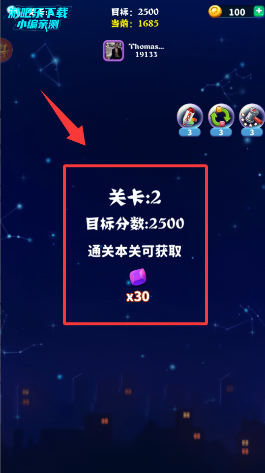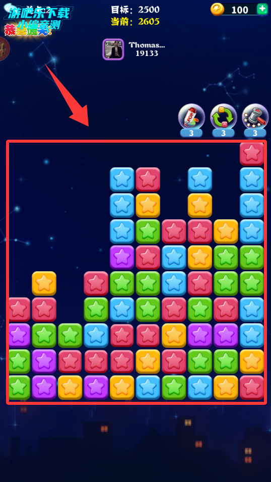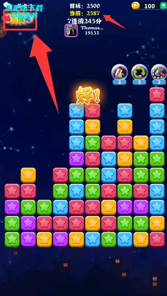 2、消除方法是,点击颜色相同成块的方块或者星星,它就能被消除,同时消除的方块越多分值越高,你也可以尽量让所有的方块被消除,那可是很厉害的。