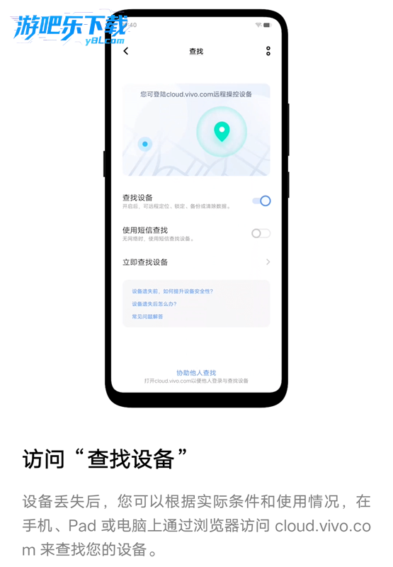 vivo查找手机官方版是预装在vivo及iQOO手机中的系统级安全功能模块。核心用于定位和保护丢失的vivo手机、平板等设备,依托vivo账号与云服务实现远程操控,全方位保障设备及数据安全!