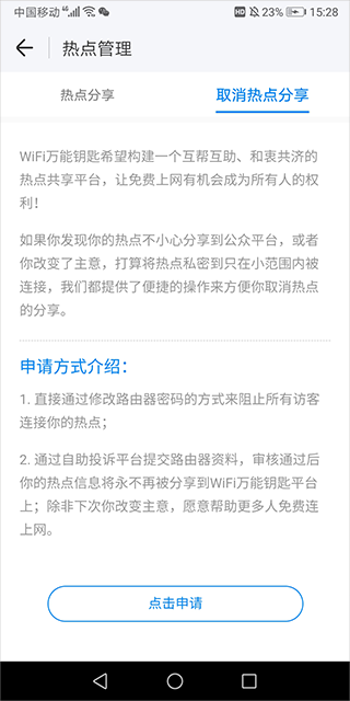 3、接着在【取消热点】页面下进行申请,或者也可以直接在路由器上改变密码也可以取消热点的