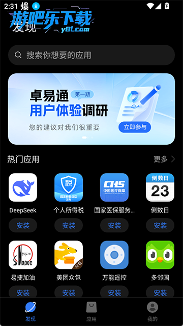 1、打开卓易通后进入应用市场,直接搜索或浏览需要的安卓应用,点击一键安装即可使用。