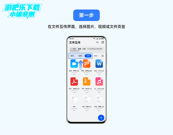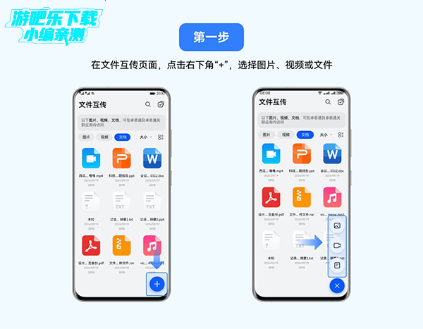 1、在文件互传界面,点击右下角+,选择图片、视频或文件。