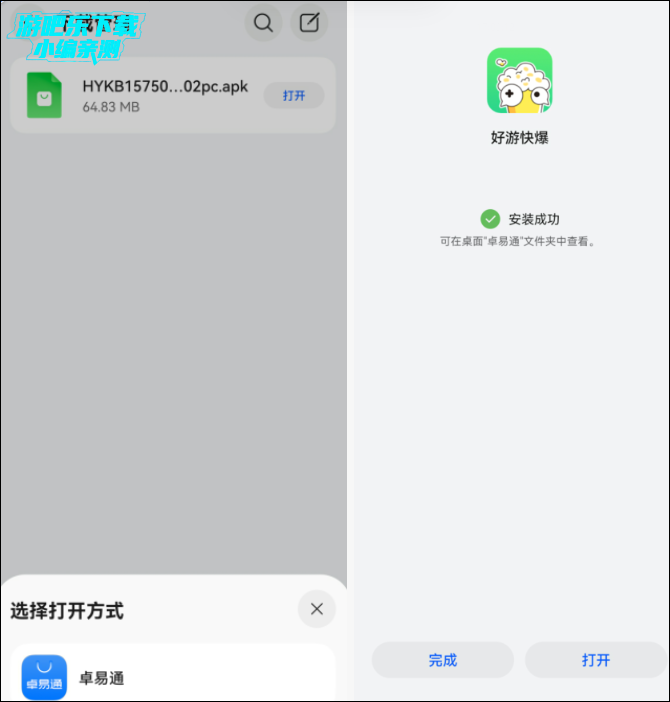 安装包下载完成后,在浏览器的【下载管理】中,点击快爆安装包,选择【卓易通】打开,即可唤起安装流程,待成功安装后,爆友们即可在设备中畅玩快爆啦~