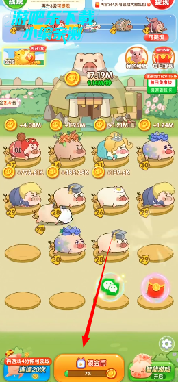 游戏规则很简单,就是把两个低级小猪合在一起,变成一个更高一级的小猪。当你合成到第6级小猪的时候,会看到右下角有个【智能游戏】的按钮被点亮了。