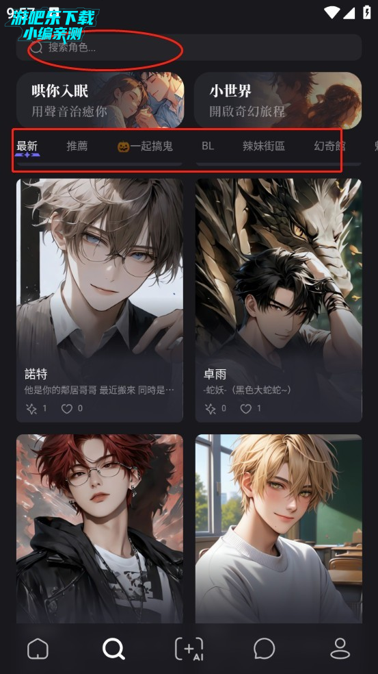 2、让我们点击最下方的搜索界面,可以通过搜索或分类等方式,找到并点击你喜欢的AI角色