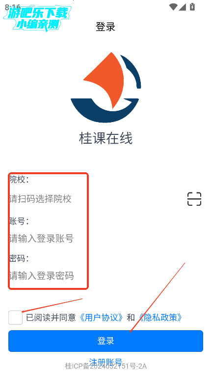 进入登录界面,扫码输入学校,输入登录账号密码,点击登录即可