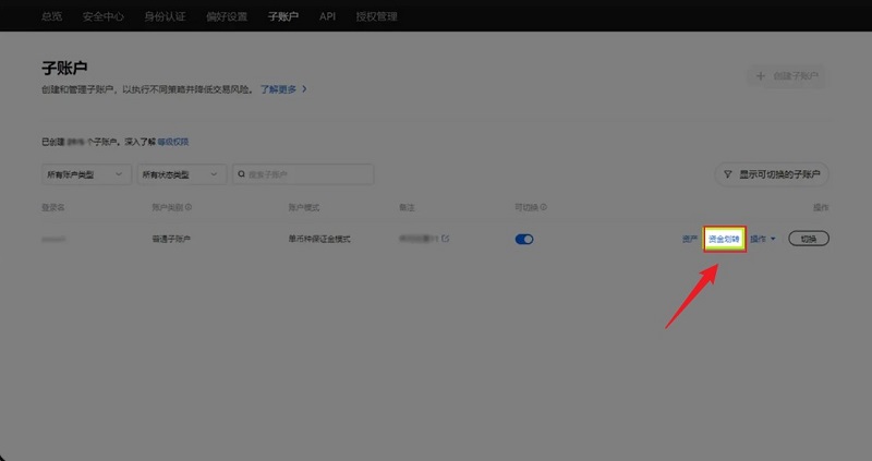 4.创建成功后,点击【资金划转】按钮,可将母账户的币划转到子账户。