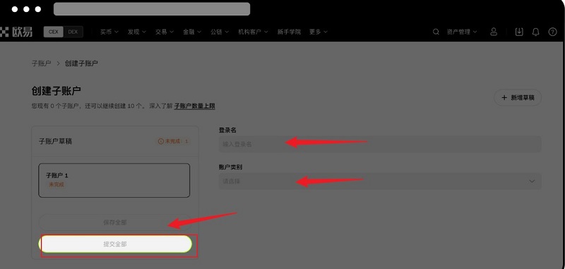 2.输入子账户登录名、选择账户类别,若需要,可以进行相关资产的充值设置,确认无误后,点击【提交全部】。