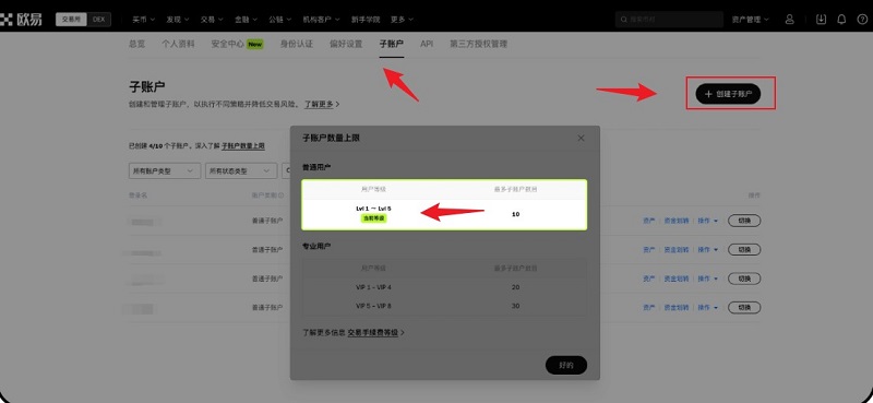 5、根据不同的用户等级,您可以创建子账户的数量是不一样的,点击创建子账户页面的 【子账户数量上限】 可以查看不同用户等级可以创建的子账户数目,个人普通用户可以创建 10 个子账户,个人专业用户根据等级可以创建 20 - 30个子账户。