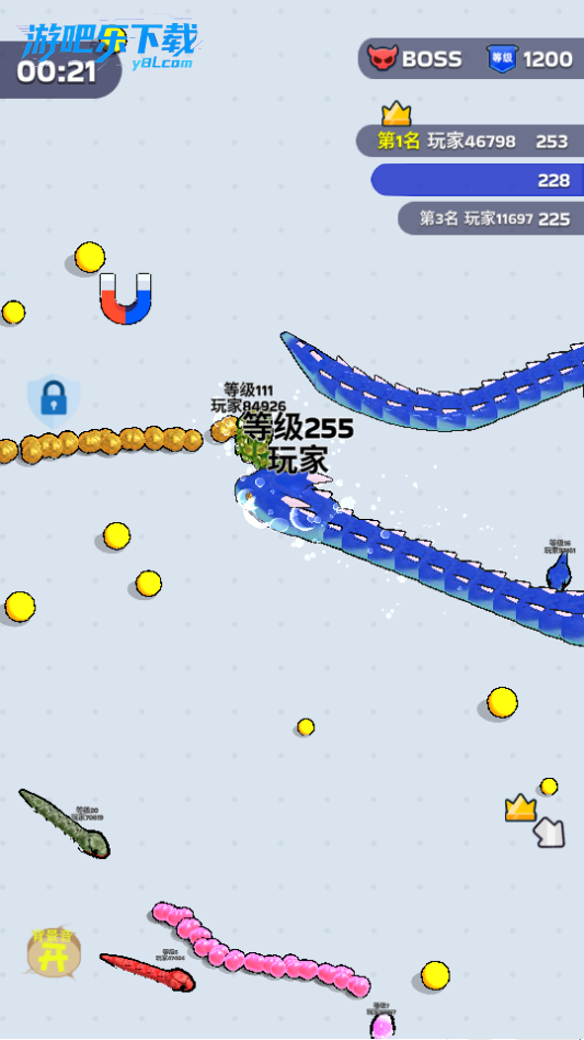 大逃杀模式:该模式中地图的安全区域会逐渐缩小,还会出现岩浆等危险区域,玩家不仅要躲避其他小蛇的撞击,还要避开危险区域,最终坚持到最后的玩家才能获胜,非常考验玩家的生存和应变能力。