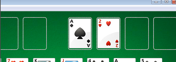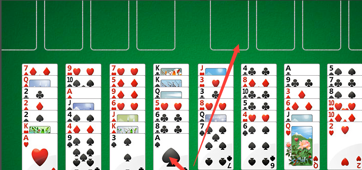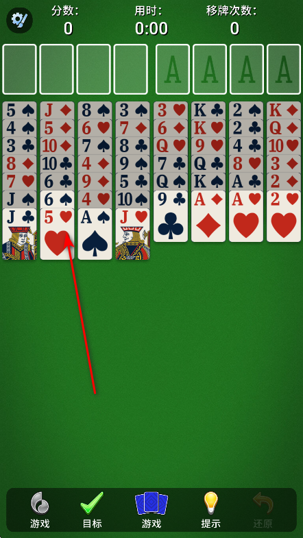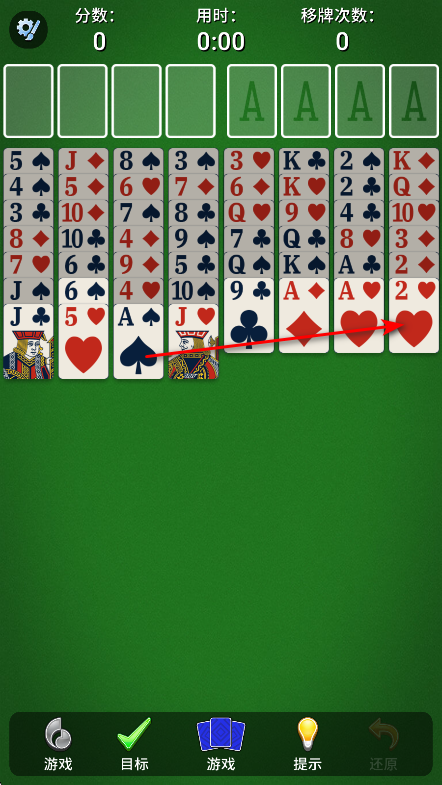2、如果牌组底部有A的话,那么可以给移动到右上方的空框处,这边是专门放A的。