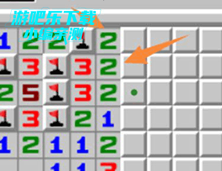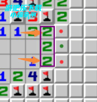 橙色箭头所指的4,周围已有3个雷通过其他方式判出,因此真实数字为1橙色箭头所指的2,周围已有1个雷通过其他方式判出,因此真实数字为1
