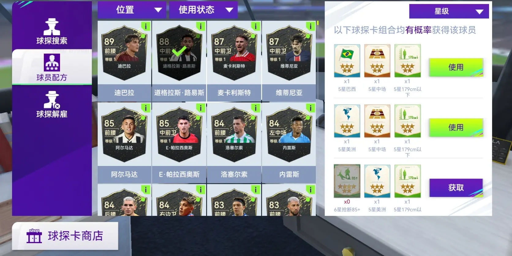 主帅可以在自己的球探库里选择三个不同类型的球探卡进行球员搜索。不过我建议各位主帅进入球员配方按照想要配方来搜索球员。