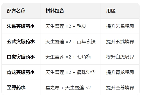 朱雀突破药水:2 天山雪莲 + 皮毛